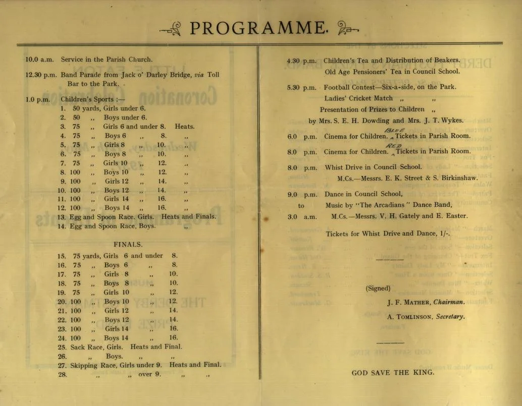 In 1925, there was a “Young Men’s Institute” run from in the old school building in Barley Close. The Institute had begun as an organisation to help young men returning from the war. The main organisers were teachers at the Primary School, by then situated on Alfreton Road. The first sports day was 1925 and the Sports Committee set up a week of activities, largely for children. The programme covered the usual races and competitions but included events for adults, such as tug of war competitions between pub teams.